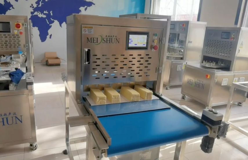 Станок ориентирован на нарезку продуктов на ломтики, использует два ультразвуковых ножа и небольшую транспортировочную ленту. Ультразвуковые колебания затрудняют прилипание ломтиков продукта к лезвиям.